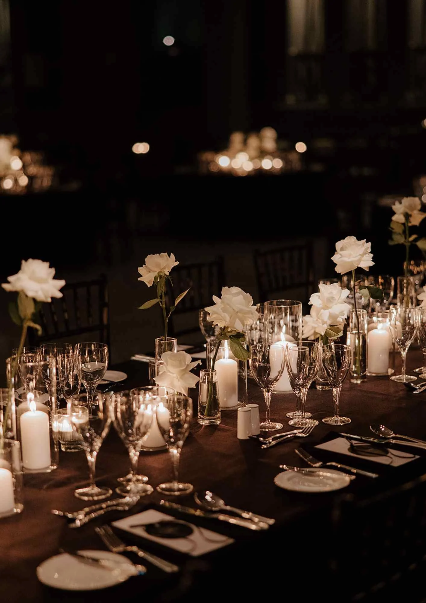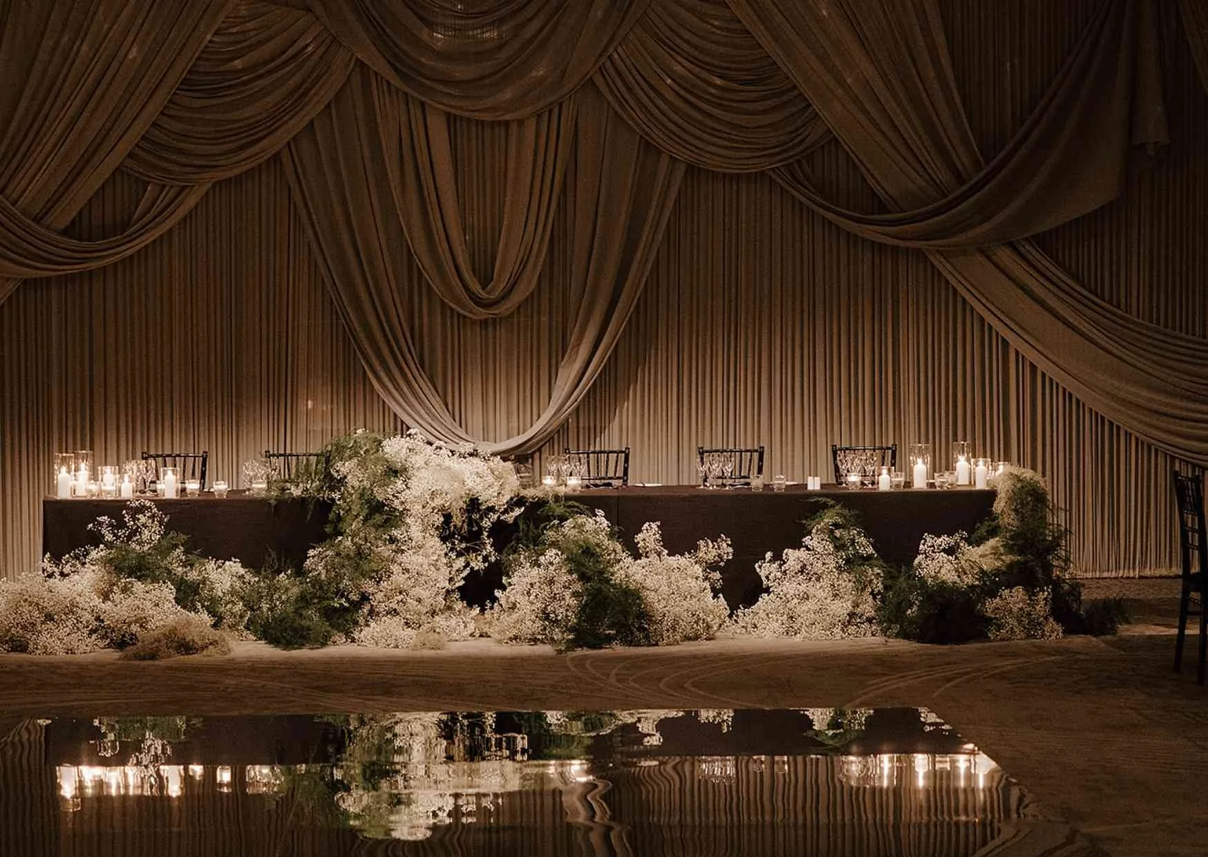 A luxurious and ethereal design for clients C&A, who The Studio worked with back in November to create a vision that felt otherworldly, with a hint of old Hollywood glamour . A timeless and sophisticated monochromatic colour palette, filled with layers upon layers of draped fabric and elegant bows.